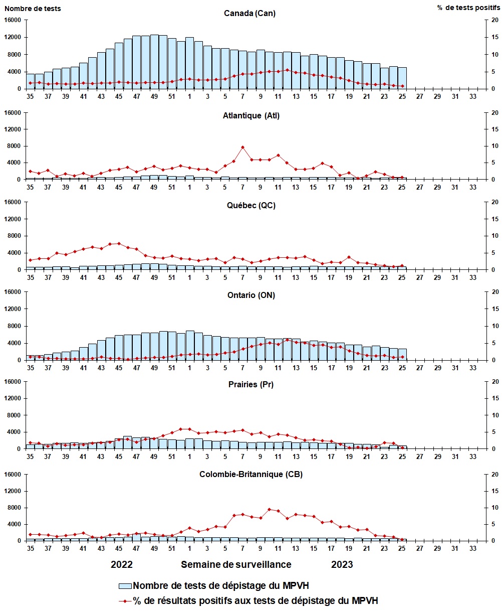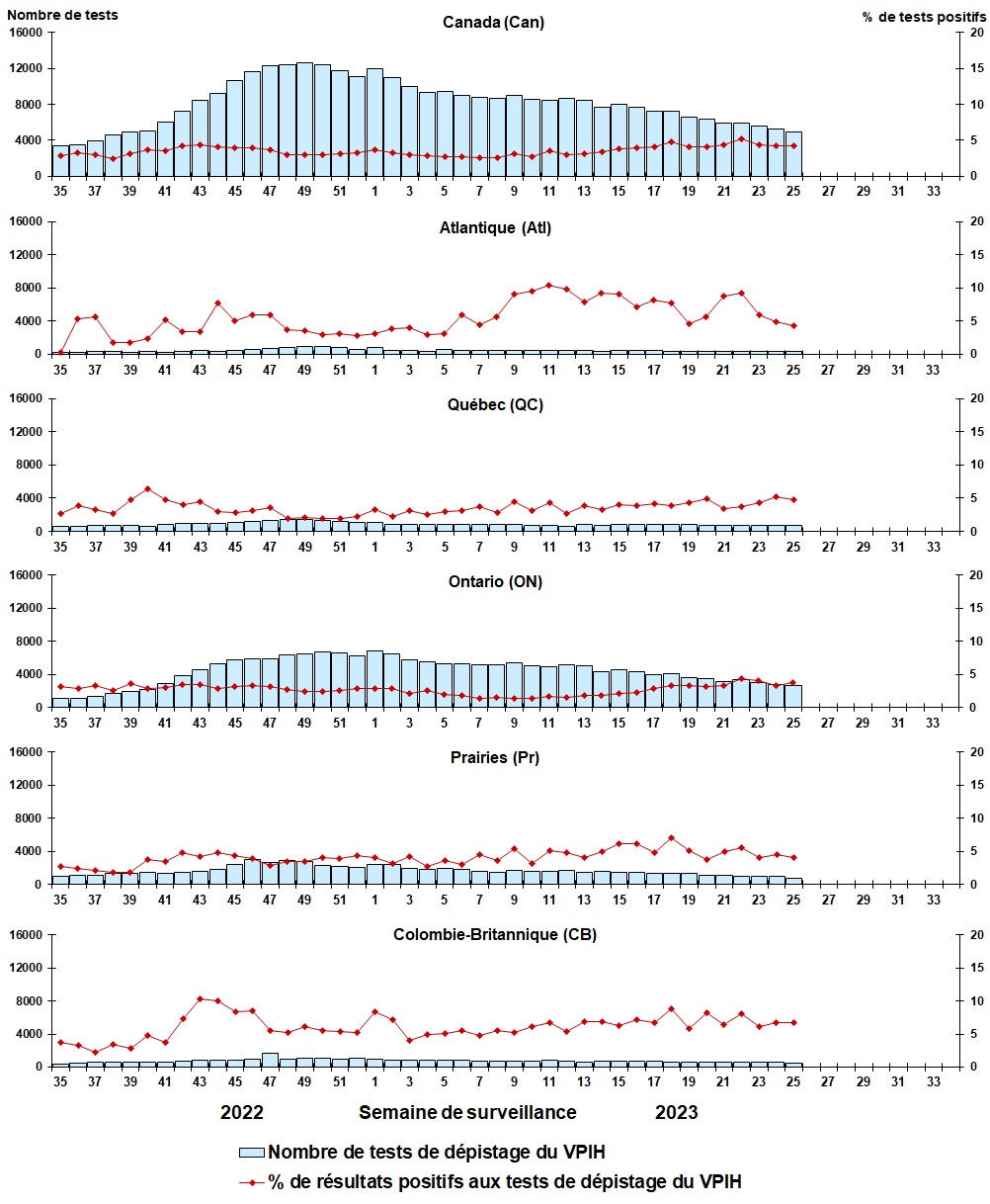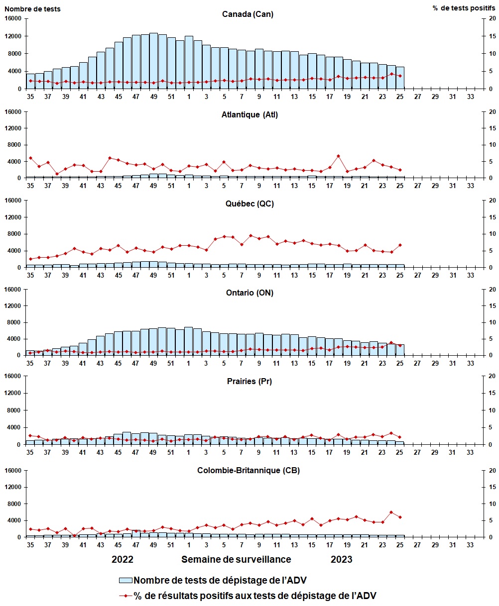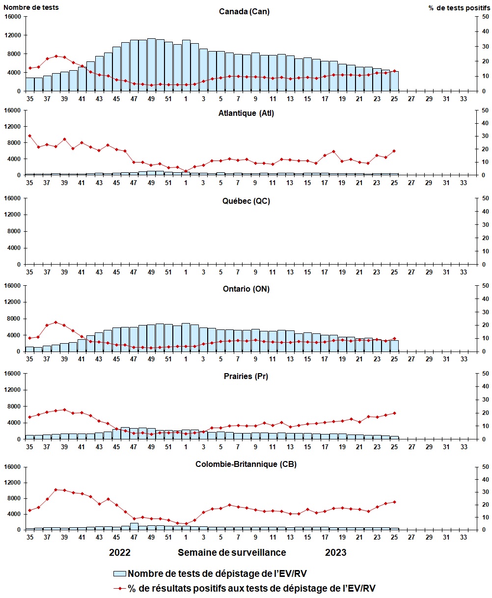 Au cours de la semaine 25 (se terminant le 24 juin 2023) au Canada, les laboratoires participants au SSDVR ont signalé 1 279 détections du SRAS-CoV-2 sur 20 797 tests (6,2 % positifs). Parmi les virus respiratoires autres que le SRAS-CoV-2, où les volumes de tests sont plus faibles (intervalle de 4 063 à 12 555 tests), l'activité de l’entérovirus/rhinovirus est la plus élevée.