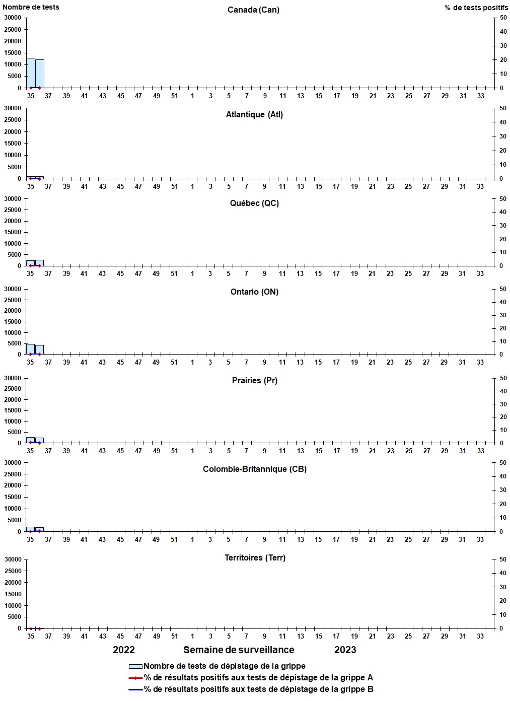 En raison des différents protocoles de test des laboratoires à travers le Canada, le nombre de détections de sous-types de la grippe A pourrait ne pas être inclus dans le nombre total de détections de la grippe A, car certaines détections de sous-types ne sont pas disponibles par le biais de tests de routine, mais sont ensuite signalées si d'autres tests de sous-types sont effectués. Dans ces cas, les détections de sous-types ne reflètent pas les détections de la grippe A destinées à être capturées par la surveillance de routine et sont exclues des détections totales et du pourcentage de positivité.