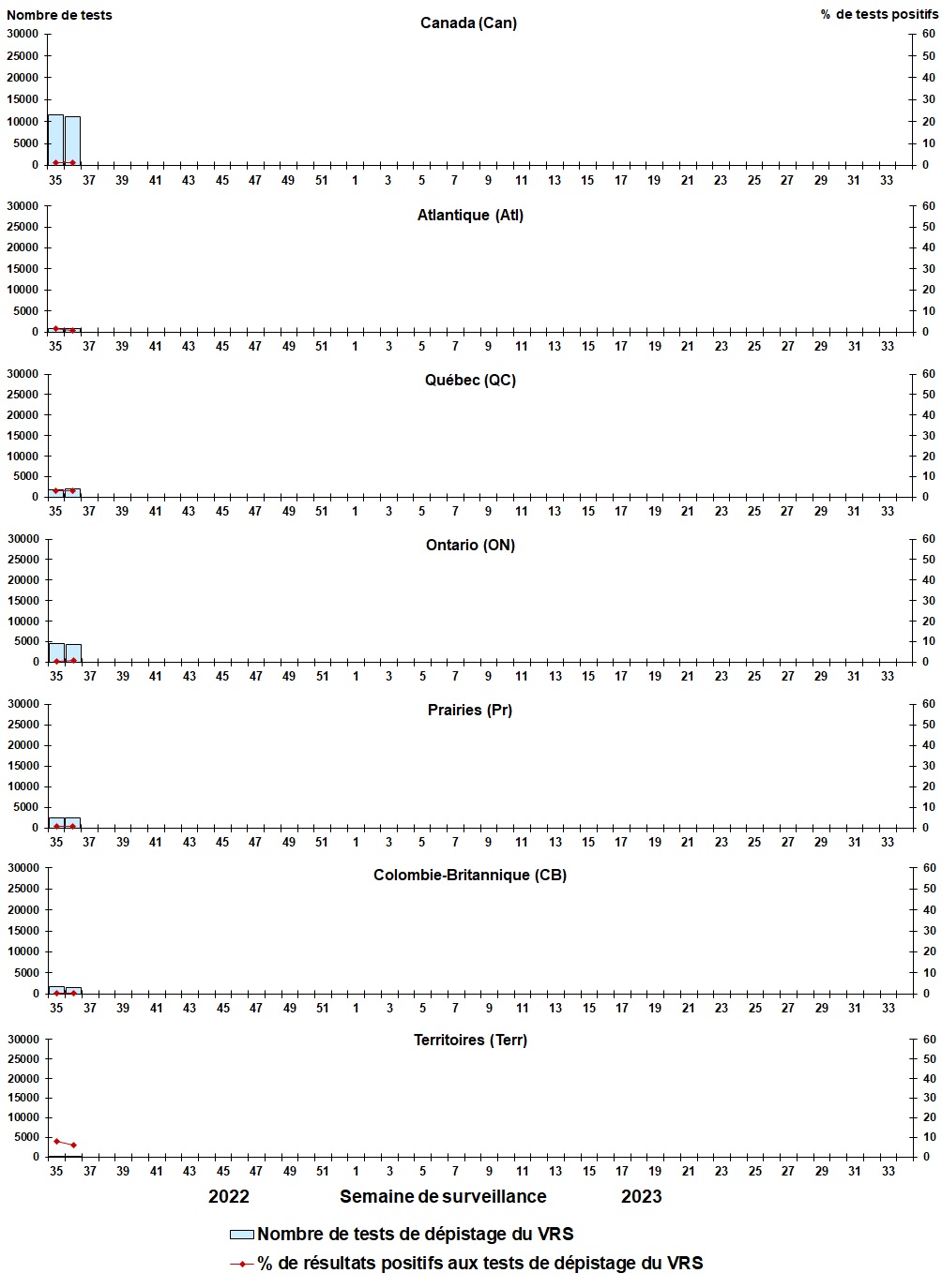 Les données du rapport du virus des voies respiratoires représentent les données de surveillance disponibles au moment de la rédaction. Les données non recueillies par le laboratoire effectuant la déclaration sont indiquées par l'acronyme N.R.