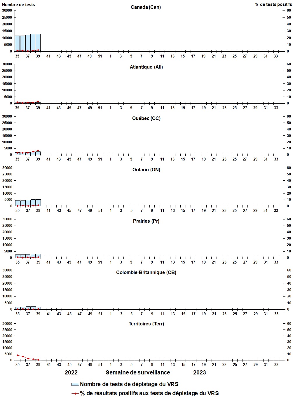 Figure 4 : Résultats positifs (%) aux tests de dépistage du virus respiratoire syncytial (VRS) au Canada par région et par semaine de surveillance