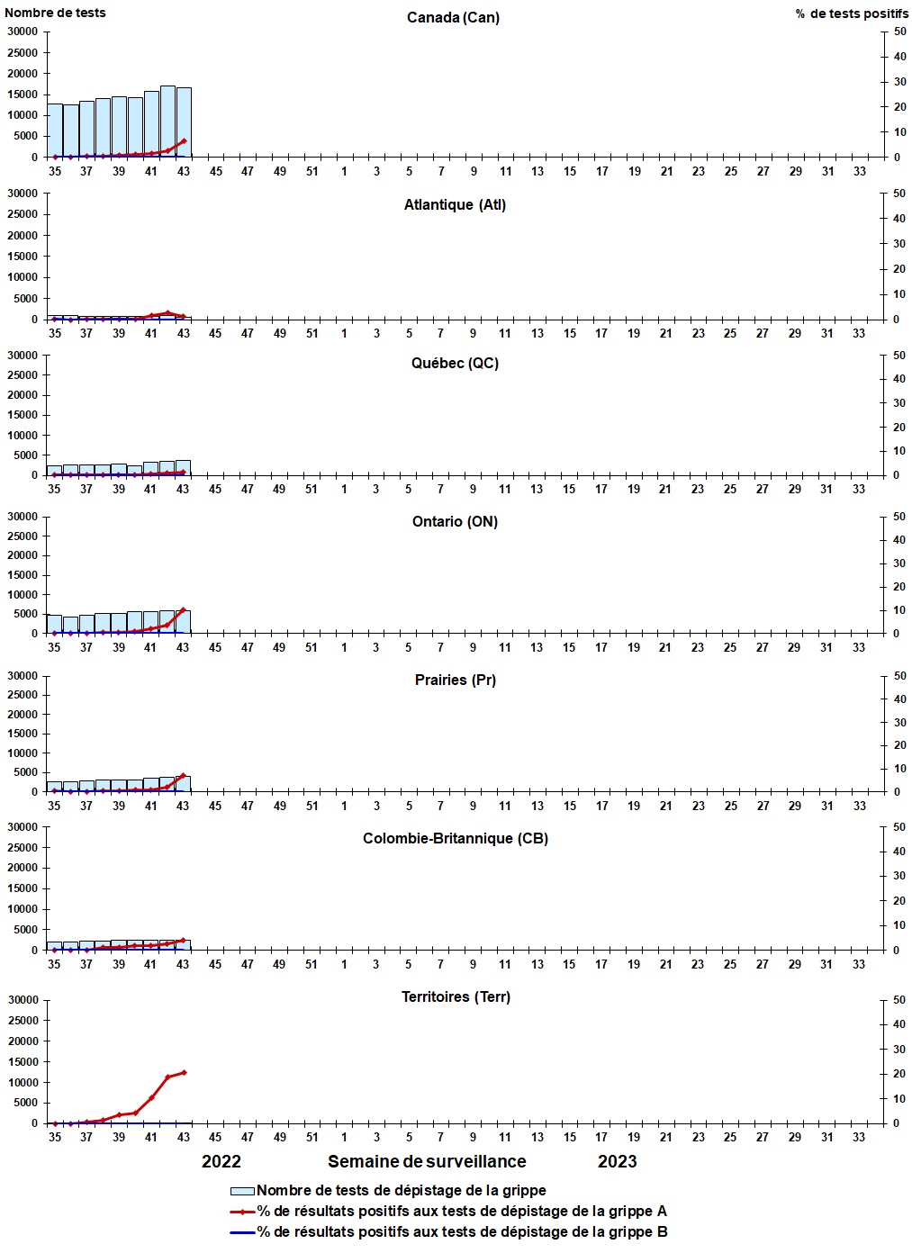 | Semaine | Fin de la semaine | Can Tests | Can A% | Can B% | Atl Tests | Atl A% | Atl B% | QC Tests | QC A% | QC B% | ON Tests | ON A% | ON B% | Pr Tests | Pr A% | Pr B% | CB Tests | CB A% | CB B% | Terr Tests | Terr A% | Terr B% |