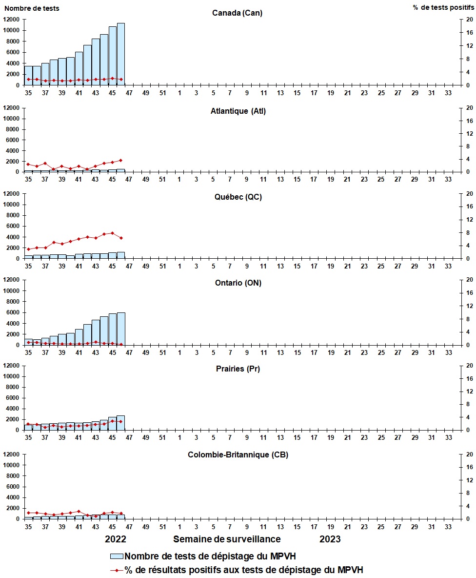 | Semaine | Fin de la semaine | Can Tests | MPVH% | Atl Tests | MPVH% | QC Tests | MPVH% | ON Tests | MPVH% | Pr Tests | MPVH% | CB Tests | MPVH% |