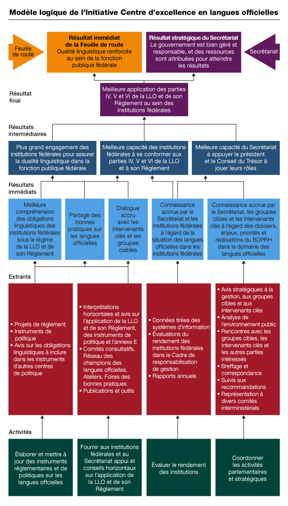 Le mécanisme de reddition de comptes de l'Initiative CELO est décrit dans le Cadre horizontal de gestion et de responsabilisation axé sur les résultats (CHGRR) de la Feuille de route. Plus précisément, l'Initiative CELO avait pour objet la réalisation d'activités qui devaient contribuer au résultat immédiat de la Feuille de route d'une « dualité linguistique renforcée au sein de la fonction publique fédérale ». Cette contribution devait se faire au moyen d'activités qui appuient le Conseil du Trésor afin qu'il puisse assumer ses responsabilités aux termes de la partie VIII de la LLO. En vertu de la partie VIII de la LLO, l'Initiative CELO devait, pour le compte du Conseil du Trésor, fournir une coordination générale et surveiller l'application des parties IV, V et VI au sein des institutions fédérales dans la poursuite des objectifs suivants :