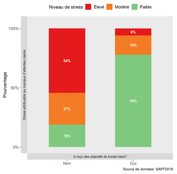 | Question sur la gestion du rendement | Source de stress | Valeur p | Existence d’une association | Test V de Cramér | Ampleur de l’effet de l’association |