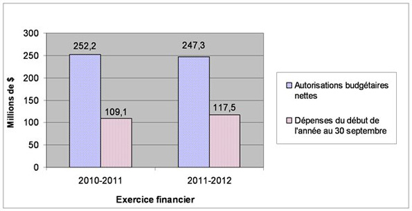 | Dépenses prévues pour l'exercice se terminant le 31 mars 2011 | Total dépensé durant le trimestre terminé le 30 septembre 2010 | Cumul des crédits utilisés à la fin du trimestre | Dépenses prévues pour l'exercice se terminant le 31 mars 2012 | Total dépensé pendant le trimestre terminé le 30 septembre 2011 | Total de l'exercice courant utilisé à la fin du trimestre | |
