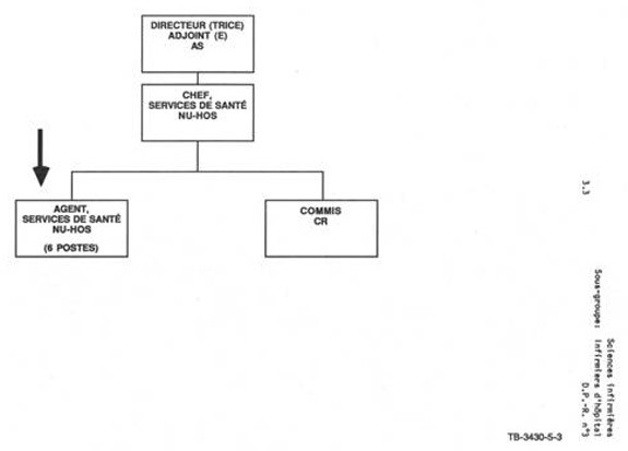 Les postes ci-haut mentionnés rendent compte au(à la) directeur(trice) des soins infirmiers (SM) qui relève du(de la) directeur(trice) général(e), services de santé des indiens et des populations du nord (MD-MOF).