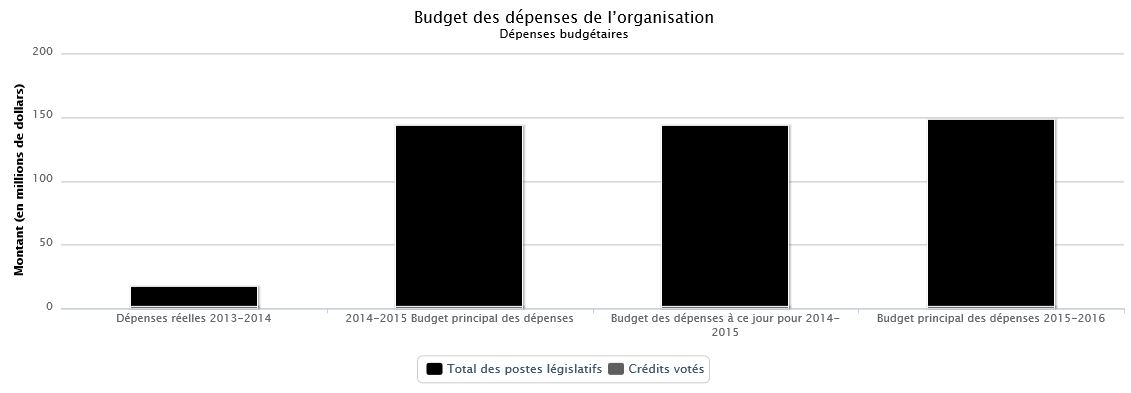 Le Bureau du vérificateur général prévoit des dépenses budgétaires de 78,3 millions de dollars pour 2015-2016. De cette somme, un montant de 68,3 millions de dollars doit être approuvé par le Parlement. Le solde de 10,0 millions de dollars représente les prévisions législatives qui ne nécessitent pas d`approbation supplémentaire; ce montant est fourni à titre indicatif.