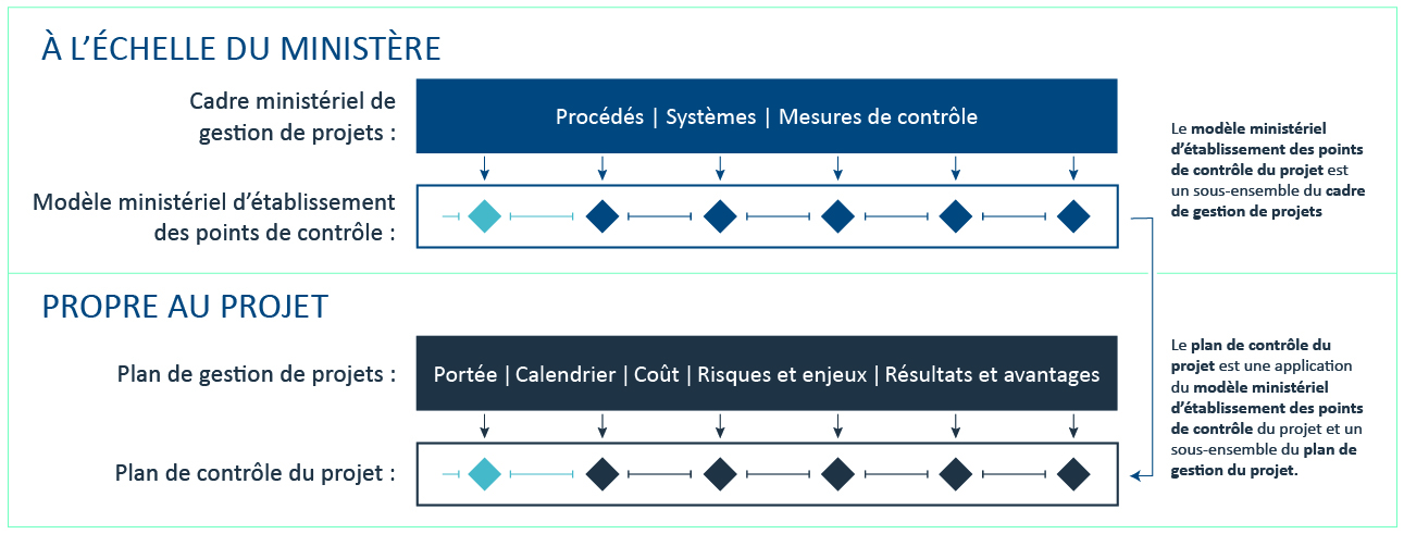 Une figure montrant que le modèle ministériel d’établissement de points de contrôle d’un projet est un sous-ensemble du cadre ministériel de gestion du projet et que le plan des points de contrôle est un sous-ensemble du plan de gestion du projet ainsi qu’une application de modèle ministériel d’établissement des points de contrôle propres au projet. La version texte suit.