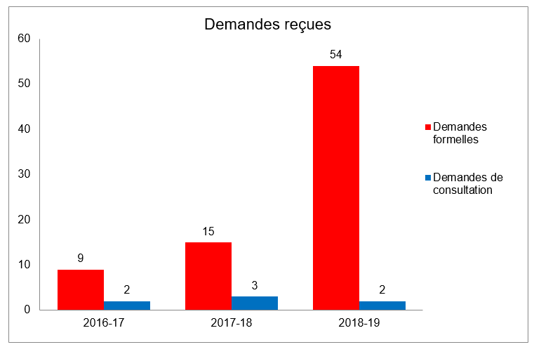 Par rapport aux trois exercices précédents, ces données indiquent une augmentation de 500% des demandes formelles. Les demandes de consultation provenant d’autres institutions gouvernementales demeurent cohérentes entre 2015-16 et 2018-19 avec une variance de deux à trois demandes par exercice.