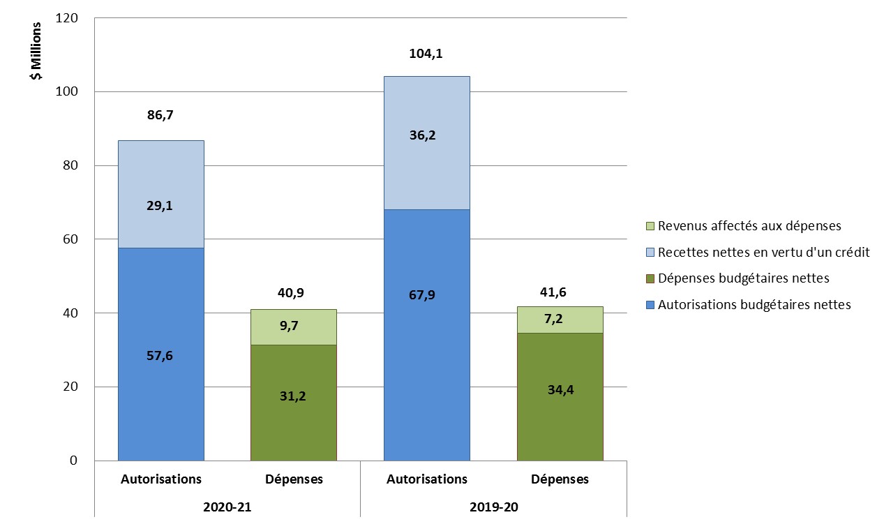 Les dépenses budgétaires brutes cumulatives totales à ce jour sont passées de 41,6 millions de dollars en 2019–2020 à 40,9 millions de dollars en 2020–2021, principalement en raison des facteurs suivants :