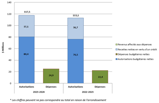 Au 30 juin 2023, les autorisations budgétaires nettes disponibles (y compris le RASE) totalisent $80,4 millions de dollars, une augmentation de 3,9 millions de dollars par rapport à l’année précédente. Cette augmentation est due au financement temporaire reçu pour remédier aux enjeux d'intégrité des programmes et les projets de réinstallation des bureaux, au financement reçu pour des ajustements de rémunération, ainsi qu’au financement d’un an lié à des report de fonds approuvés.
