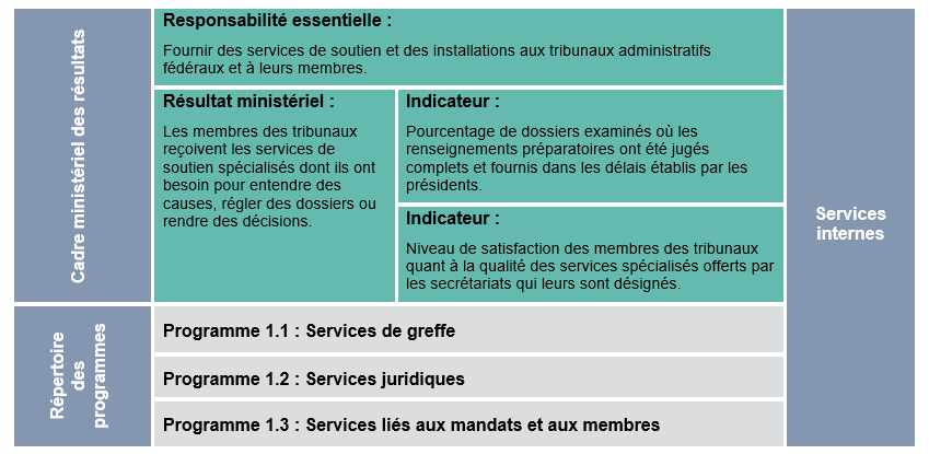 L'image représente le cadre ministériel des résultats du SCDATA qui comprend les éléments suivants. Responsabilité essentielle: Service de soutien et des installations aux tribunaux administratifs fédéraux et leurs membres. Résultat ministériel: Les membres des tribunaux reçoivent les services de soutien spécialisés dont ils ont besoin pour entendre des causes, régler des dossiers ou rendre des décisions. Indicateur 1: Pourcentage de dossiers examinés où les renseignements préparatoires ont été jugés complets et fournis dans les délais établis par les présidents. Indicateur 2:Le niveau de satisfaction des membres des tribunaux quant à la qualité des services spécialisés offerts par les secrétariats qui leurs sont désignés. Répertoire des programmes - Programme 1.1 Services de greffe, Programme 1.2 Services juridiques, Programme 1.3 Services liés aux mandats et aux membres, Services internes.