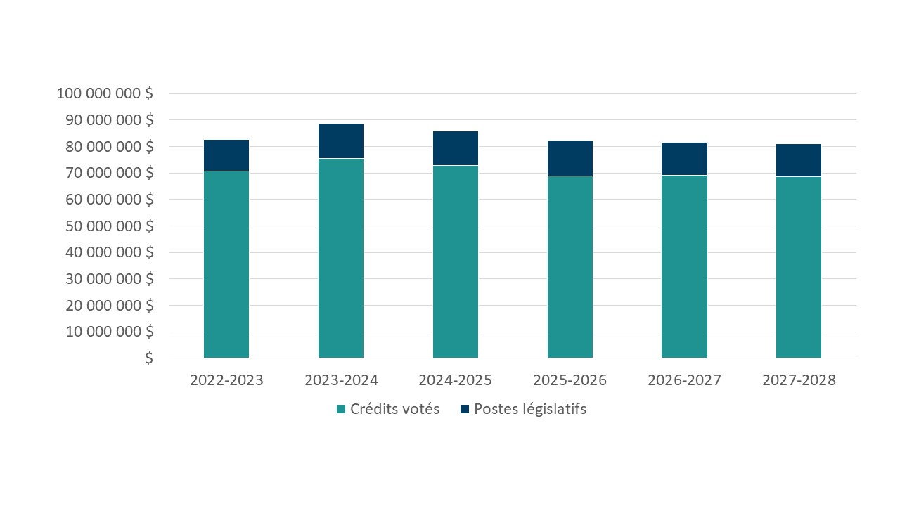 Le graphique 2 résume le financement voté et législatif du ministère pour la période de l’exercice 2022 à 2023 jusqu’à l’exercice 2027 à 2028.