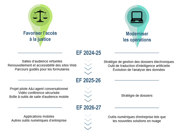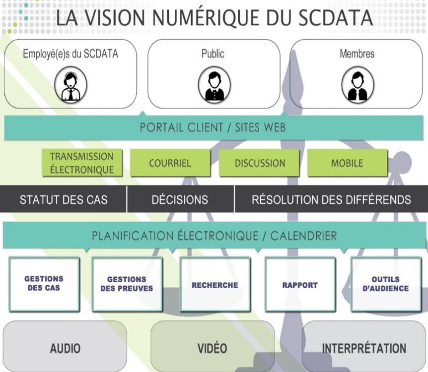 Modernisation des activités : Le SCDATA modernise ses activités pour aider les tribunaux à répondre plus efficacement aux besoins des acteurs, des intervenants et du public. Les nouvelles technologies sont déployées de manière intelligente, sûre et sécurisée pour aider les tribunaux à gérer efficacement leur charge de travail et, surtout, à exercer leurs fonctions de supervision de l’administration de la règle de droit. Le SCDATA mise sur l’innovation pour réorienter des ressources limitées au profit d’efforts visant à assurer la durabilité et l’efficacité des activités.