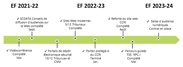 Aujourd’hui, je suis heureux d’annoncer qu’en collaboration avec les tribunaux, le SCDATA a mis en œuvre avec succès la majorité des initiatives numériques énoncées dans la stratégie initiale. Il a mis en place de nouveaux portails de dépôt électronique, de nouveaux sites Web, de nouvelles audiences virtuelles et un parcours guidé. Ces efforts visent à promouvoir un système de justice numérique qui répond aux besoins des gens servis par les tribunaux.