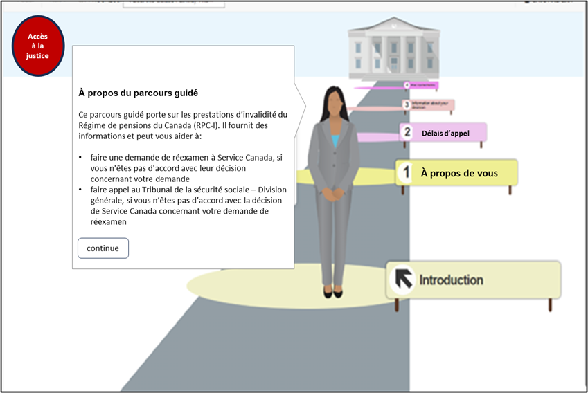 Parcours guidés – En mai 2023, le Tribunal de la sécurité sociale (TSS) a lancé un nouveau projet pilote innovant destiné à aider le public et les acteurs à se retrouver dans le processus d’appel judiciaire complexe et à remplir facilement des formulaires générés automatiquement tout au long de leur parcours. La solution a été fournie en partenariat avec Éducation juridique communautaire Ontario (EJCO). Elle propose un « parcours guidé » aux appelants qui déposent un appel dans le cadre du Programme de prestations d’invalidité du Régime de pensions du Canada (PPIRPC). Cette réalisation constitue une étape particulièrement importante. En effet, elle aide les appelants qui se représentent eux-mêmes et ont souvent du mal à comprendre les règles et les procédures d’appel. Le parcours guidé aide à réduire la frustration des appelants ainsi qu’à composer avec la demande, le besoin croissant d’assistance, les demandes répétées d’informations et le dépôt fréquent de nouveaux documents. Pour en savoir plus, visitez l’adresse URL des parcours guidés : Adresse URL du parcours guidé du PPIRPC : Bienvenue sur les parcours guidés