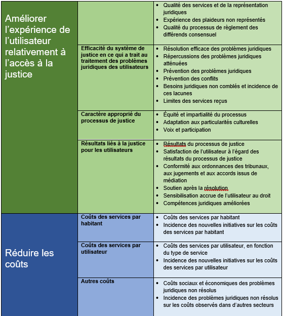 Voir le document Access to Justice BC, Access to Justice Measurement Framework (en anglais seulement) comme exemple de modèle de cadre de mesure de l’accès à la justice :