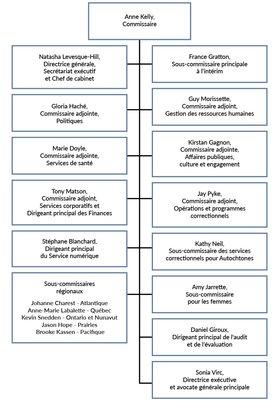 Service correctionnel Canada est dirigé par la commissaire du Service correctionnel, qui relève du ministre de Sécurité publique du Canada. La commissaire est appuyée par un comité de direction qui est composé de cadres œuvrant aux paliers national et régional.