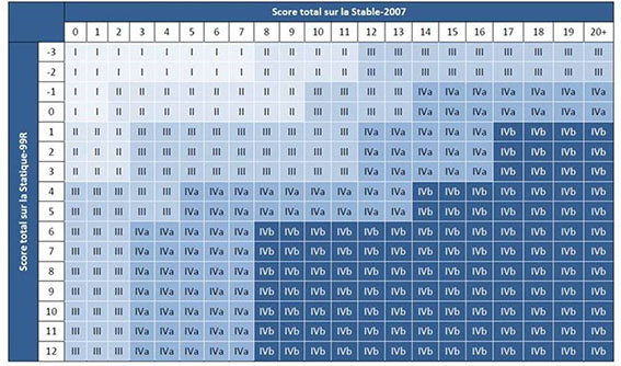 Le tableau illustre comment le score total d’un délinquant sur l’échelle Statique 99R et celui sur la Stable 2007 sont combinés pour fournir un niveau de risque global pour la délinquance sexuelle. Les scores sur la Statique 99R varient de -3 à +12, tandis que ceux sur la Stable 2007 peuvent varier de 0 à +26. La combinaison des résultats des deux outils d’évaluation du risque donne un niveau de risque global de I, II, III, IVa ou IVb; les niveaux élevés indiquant une probabilité de récidive plus grande que les niveaux inférieurs.