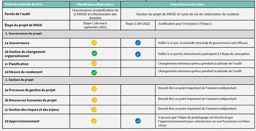 - Le SCC devrait s’assurer que la structure de gouvernance de la MSGD a une visibilité claire des dépendances de la MSGD envers d’autres projets et des risques et enjeux connexes.