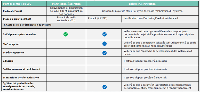 Fournir l’assurance que le SCC a mis en œuvre une méthode efficace relative au cycle de vie de l’élaboration du système qui comprend les exigences opérationnelles, la conception, le développement, les essais, la mise en œuvre et le déploiement, la transition vers les opérations, ainsi que la sécurité, la protection des renseignements personnels et les contrôles internes.