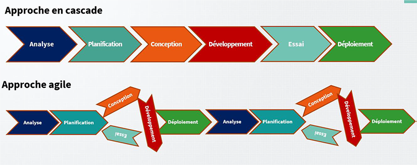 Le développement agile a gagné en popularité, surtout dans le secteur privé, où l’on s’est éloigné des modèles plus traditionnels utilisant le développement en cascade, qui subdivisent les projets en étapes séquentielles linéaires et mettent l’accent sur la planification détaillée dès le départ. Les projets utilisant l’approche en cascade comprennent une définition complète et détaillée des exigences et des détails techniques dès le départ, et l’exécution du projet est axée sur la livraison de la solution conformément au plan. L’approche en cascade convient mieux aux projets pour lesquels les exigences et la solution peuvent être bien définies au départ.
