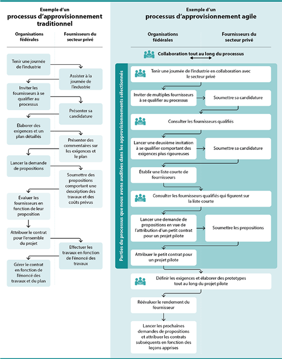 Cet organigramme compare des exemples de processus d’approvisionnement traditionnel et d’approvisionnement agile dans l’administration fédérale.