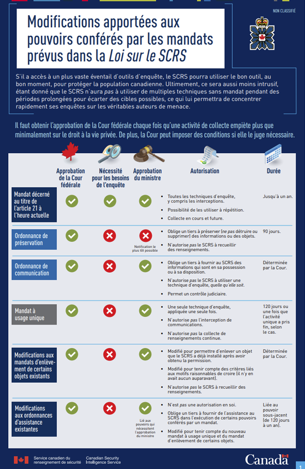 Le projet de loi C-70, Loi concernant la lutte contre l’ingérence étrangère, a modifié la Loi sur le Service canadien du renseignement de sécurité (Loi sur le SCRS), élargissant l’éventail d’outils d’enquête dont dispose le SCRS, qui pourra ainsi utiliser le bon outil, au bon moment, pour protéger la population canadienne. Dans l’ensemble, ces mesures pourraient aussi se révéler moins envahissantes, puisque le SCRS n’aura pas à utiliser de multiples techniques sans mandat pendant de longues périodes pour écarter des cibles possibles, ce qui lui permettra de concentrer rapidement ses enquêtes sur les véritables auteurs de menace.