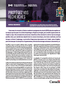 Le préjudice à la prospérité collective du Canada est difficile à mesurer, mais il n’en est pas moins bien réel. Par conséquent, il est important que les Canadiens soient mieux informés des menaces de manière à ce qu’ils puissent continuer d’innover, de collaborer, d’établir des partenariats et de prospérer avec une bonne compréhension des risques et de la façon de s’en protéger. Le SCRS communique avec des parties des secteurs touchés pour améliorer la connaissance de la situation sécuritaire des différentes provinces et de l’ensemble du Canada. Il fournit des informations à des représentants de l’industrie, des organismes gouvernementaux et non gouvernementaux et des universités pour que toutes ces parties prennent les mesures nécessaires pour protéger leurs informations, les fruits de leurs recherches, leurs propriétés intellectuelles et leurs investissements. L’appareil de sécurité nationale du gouvernement du Canada et les communautés d’affaires et universitaires ont un intérêt commun : améliorer leurs connaissances des menaces d’espionnage d’origine étatique visant le Canada pour atténuer leurs répercussions sur la croissance de l’économie et leur capacité à innover. En d’autres mots, le SCRS vous offre son aide pour protéger les biens de votre organisme, son personnel et sa réputation.