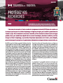 Le préjudice à la prospérité collective du Canada est difficile à mesurer, mais il n’en est pas moins bien réel. Par conséquent, il est important que les Canadiens soient mieux informés des menaces de manière à ce qu’ils puissent continuer d’innover, de collaborer, d’établir des partenariats et de prospérer avec une bonne compréhension des risques et de la façon de s’en protéger. Le SCRS communique avec des parties des secteurs touchés pour améliorer la connaissance de la situation sécuritaire des différentes provinces et de l’ensemble du Canada. Il fournit des informations à des représentants de l’industrie, des organismes gouvernementaux et non gouvernementaux et des universités pour que toutes ces parties prennent les mesures nécessaires pour protéger leurs informations, les fruits de leurs recherches, leurs propriétés intellectuelles et leurs investissements. L’appareil de sécurité nationale du gouvernement du Canada et les communautés d’affaires et universitaires ont un intérêt commun : améliorer leurs connaissances des menaces d’espionnage d’origine étatique visant le Canada pour atténuer leurs répercussions sur la croissance de l’économie et leur capacité à innover. En d’autres mots, le SCRS vous offre son aide pour protéger les biens de votre organisme, son personnel et sa réputation.