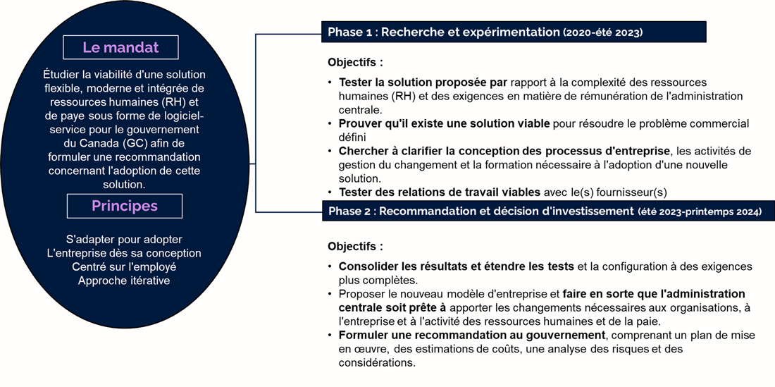 L'initiative a été créée pour évaluer la viabilité de l'adoption d'une solution SaaS afin de satisfaire les exigences de RH et paye du GC, ainsi que pour atteindre les 4 objectifs de la Phase 1.