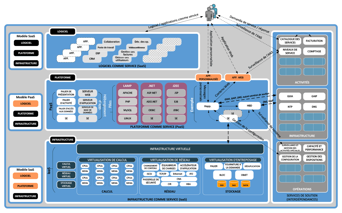| PaaS | Plateforme comme service - Permet au consommateur de déployer sur l'infrastructure en nuage des applications qu'il a acquises ou créées à l'aide d'outils et de langages de programmation pris en charge par le fournisseur. |
