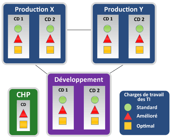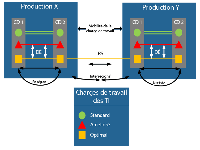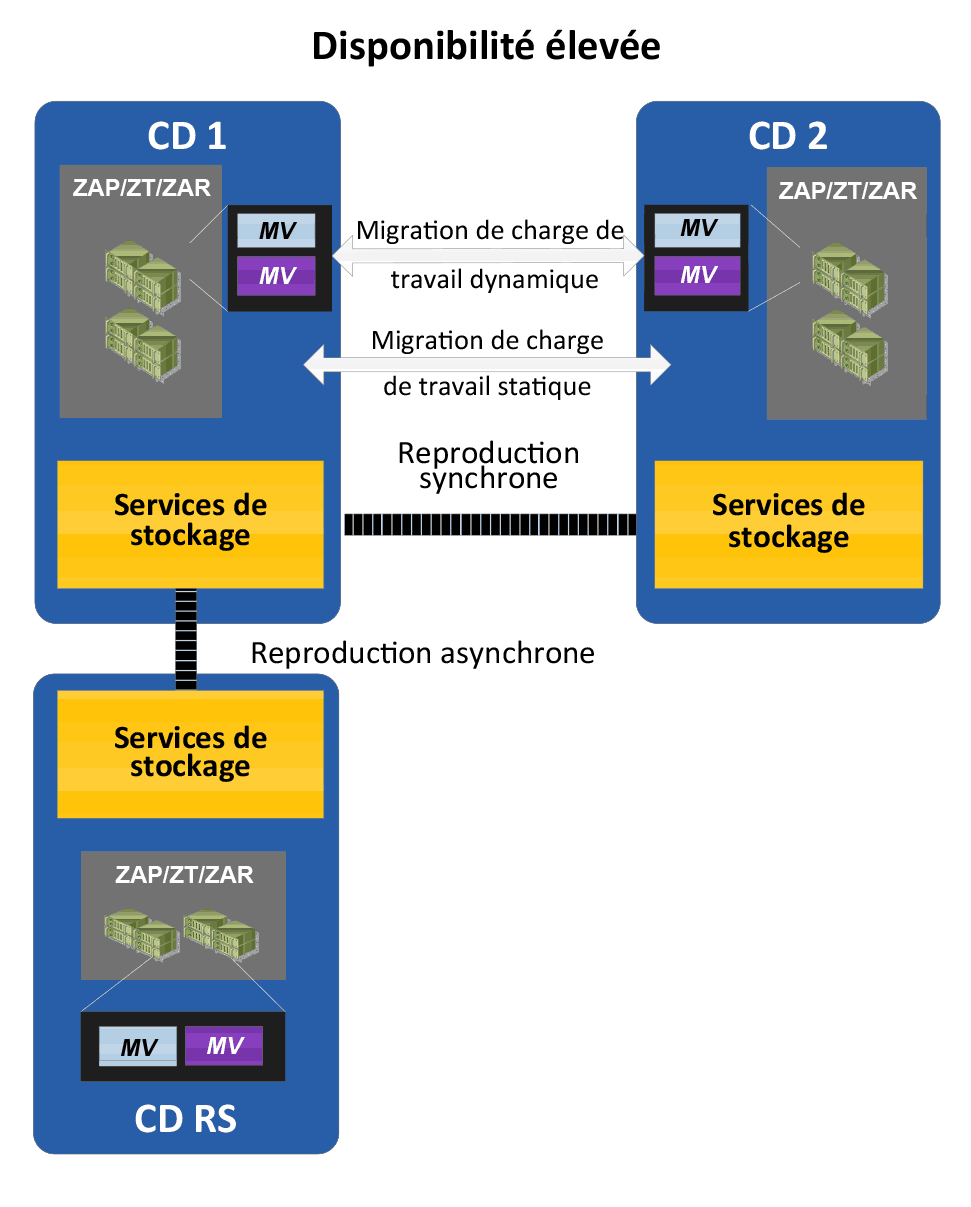 | DE | Disponibilité élevée - Protection des services de tous les CD d'une même région à l'aide de diverses techniques telles que la reprise automatisée, le regroupement des services et la reproduction synchrone sur le réseau, la plateforme et les couches mémoires. |
