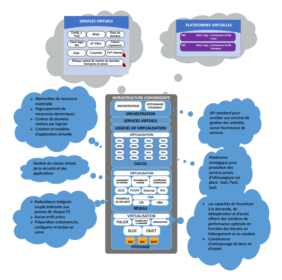 - souplesse rapide :tire parti des capacités inhérentes au libre-service et au bassin de ressources pour offrir la possibilité d'élargir ou de réduire la capacité sur demande (puissance de traitement, stockage, réseau);