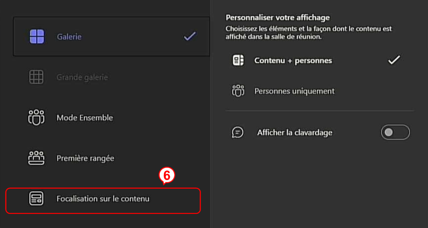 Focalisation sur le contenu (6) est le mode standard dans lequel seul le contenu que vous partagez s'affiche. Votre vidéo n'apparaît pas dans le contenu partagé.