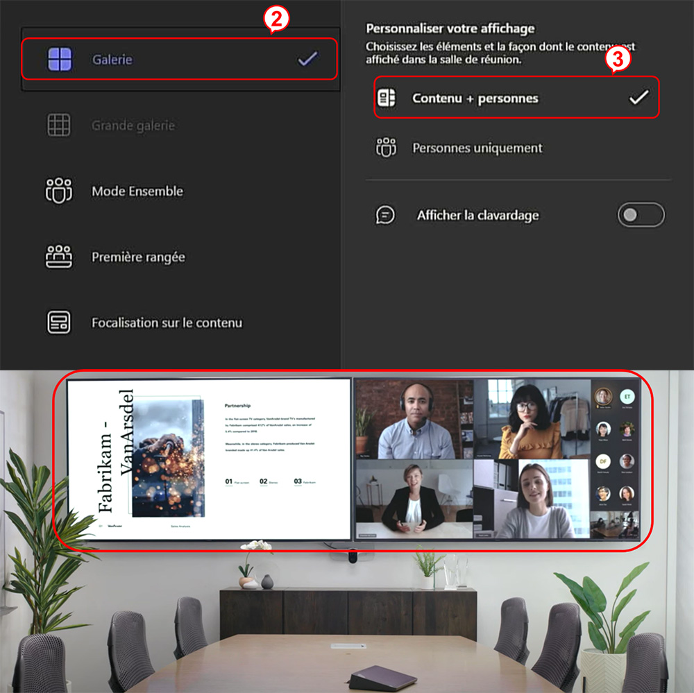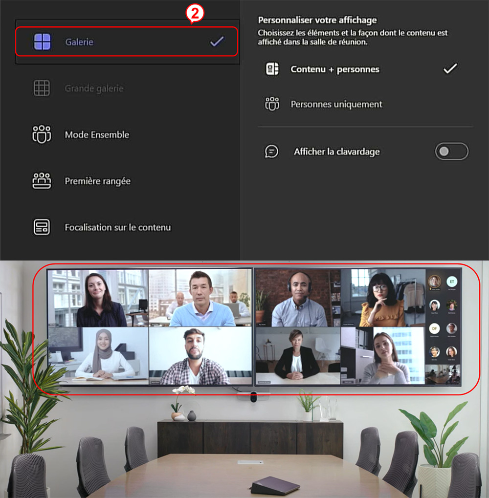En combinant l'option Galerie (2) avec l'option Contenu + personnes (3) , les contenus partagés et les participants sont affichés en mode Galerie.