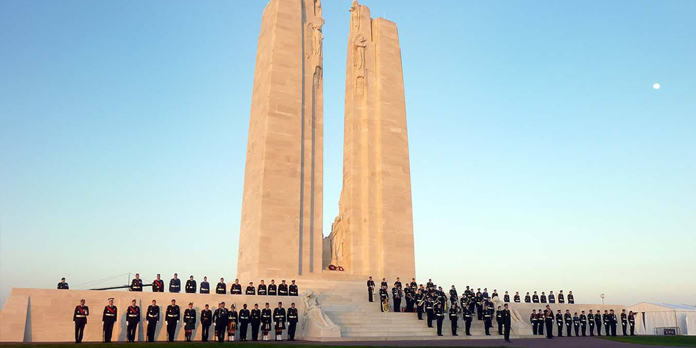 En avril 1917, les soldats canadiens ont pris d’assaut la crête de Vimy dans le nord de la France et s’en sont emparés, remportant ainsi une victoire aussi célèbre que coûteuse. La crête est aujourd’hui le site du Mémorial national du Canada à Vimy, le monument commémoratif de la Première Guerre mondiale du Canada en France. Construit entre 1925 et 1936, il se dresse sur un terrain de plus de 110 hectares, autrefois un champ de bataille.