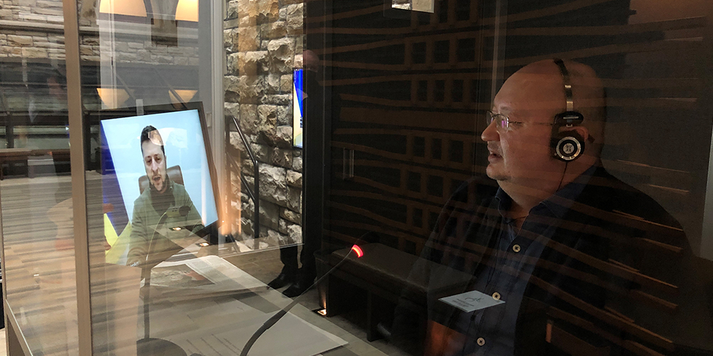 « Nous nous sommes efforcés de réunir le plus rapidement possible le plus d'information que nous pouvions pour aider les interprètes à se préparer », a souligné l'un des deux coordonnateurs, Joseph Song Chi, interprète principal au Bureau de la traduction. Par exemple, les terminologues du Bureau de la traduction ont préparé un glossaire des termes susceptibles d'être utilisés, et les interprètes ont consulté les récents discours du président Zelenskyy devant les parlements du Royaume-Uni et de l'Union européenne ainsi que le Conseil de l'Europe pour se familiariser avec sa manière de s'exprimer et les notions abordées. »