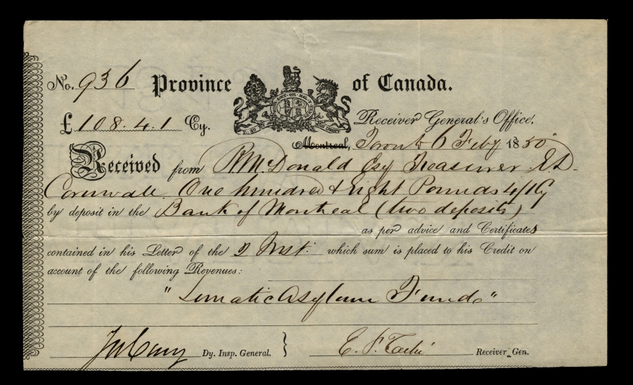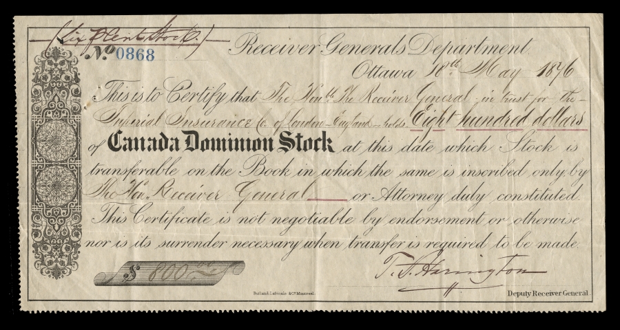 Receiver Generals Department, Ottawa, 11th May 1846, This is to Certify that The Hon. The Receiver General in trust for the Imperial Insurance Co. of London, England, holds Eight hundred dollars of Canada Dominion Stock at this date which Stock is transferable on the Book in which the same is inscribed only by The Hon. Receiver General ______ or Attorney duly constituted.