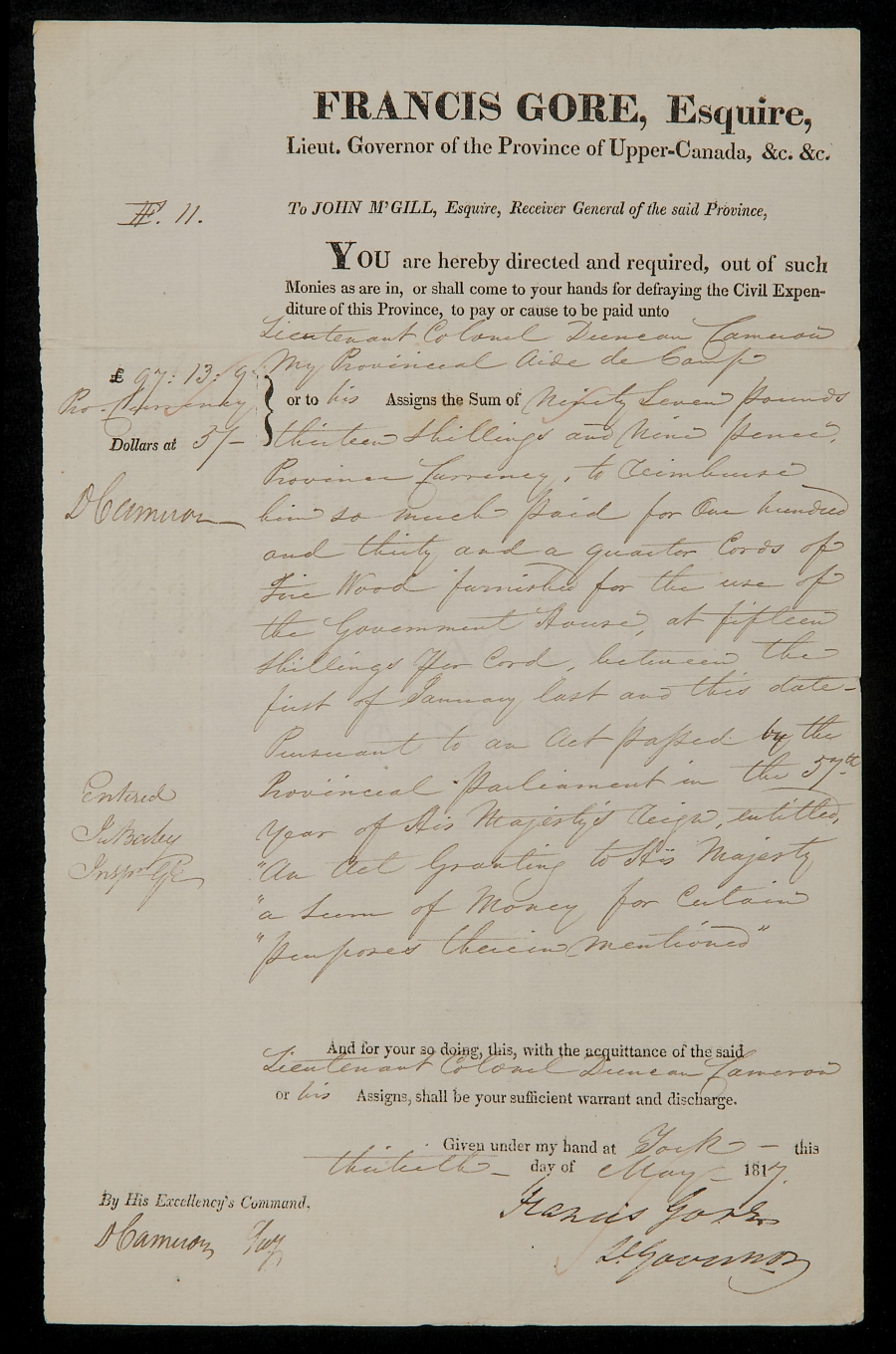 You are hereby directed and required, out of such Monies as are in, or shall come to your hands for defraying the Civil Expenditure of this Province, to pay or cause to be paid unto Lieutenant Colonel Duncan Cameron, My Provincial Aide de camp or to his Assigns the Sum of Ninety Seven Pounds Thirteen Shillings and Nine Pounds. Province Currency, to reimburse him so much paid for Our hundred and thirty and a quarter cords of fire wood furnished for the use of the Government House, at fifteen Shillings per cord, between the first of January last and this date. Pursuant to an Act drafted by the Provincial Parliament in the 57th Year of his Majesty's reign, entitled an Act Granting to His Majesty a Sum of Money for Certain Purposes therein mentioned.