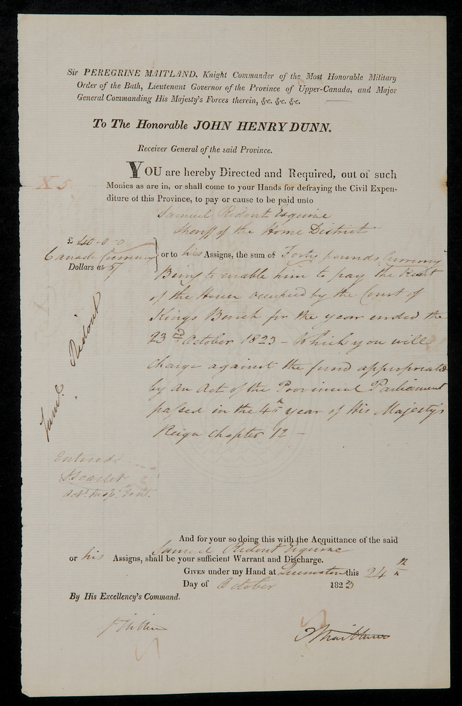or to his Assigns, the sum of Forty pounds Currency bring to enable him to pay the rest of the House occupied by the Court of the Kings Bench for the year under the 23rd October 1823 – which you will charge against the fund appropriate by an Act of the Provincial Parliament drafted in the 4th year of His Majesty’s Reign Chapter 12