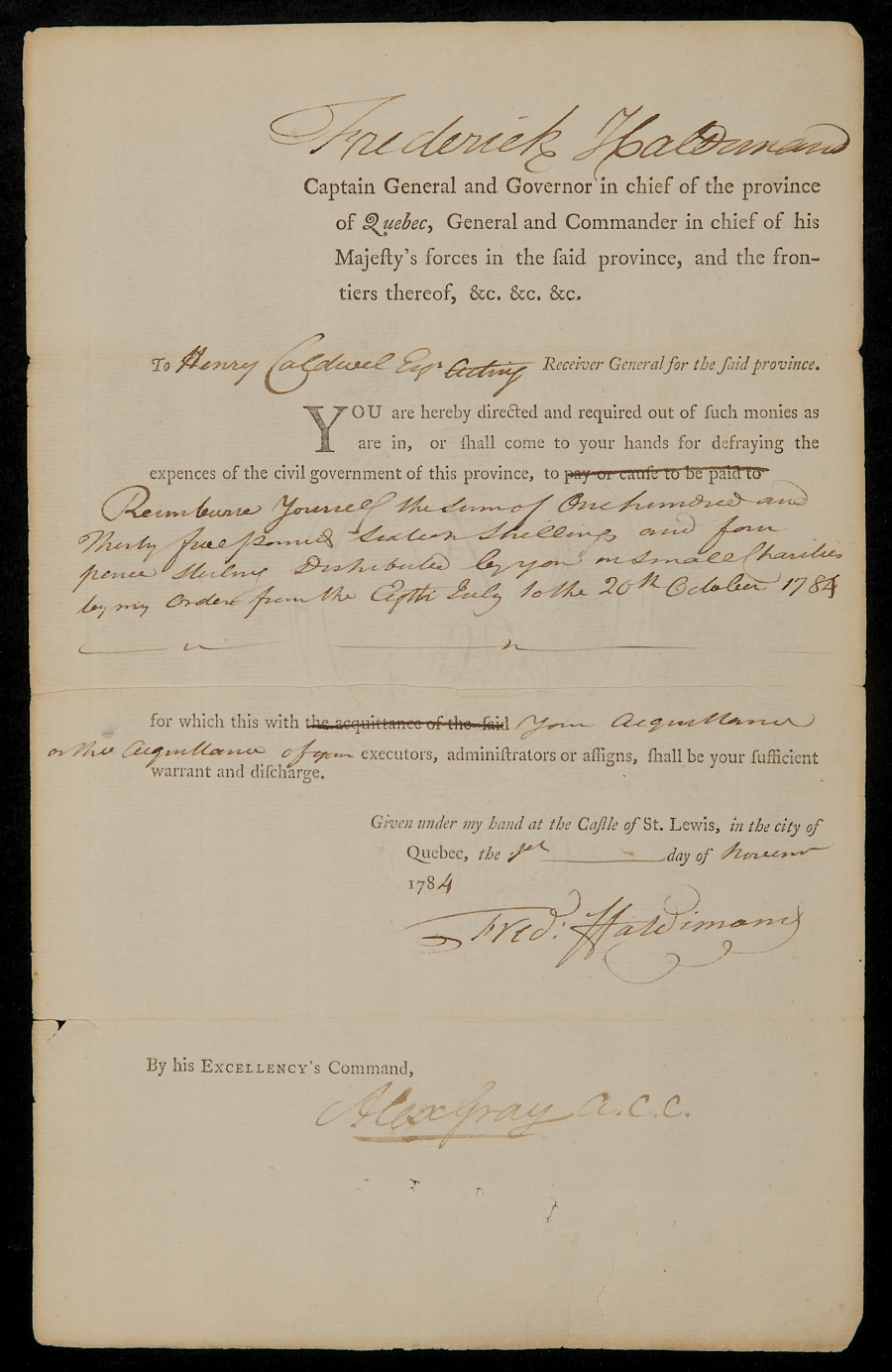 You are hereby directed and required out of fuch monies as are in, or fhall come to your hands for defraying the expenses of the civil government of this province, to Reimburse Yourself the Sum of One hundred and thirty five pounds sixteen shillings and four pence sterling distributed by you on small charities by my Order from the Eight July to the 20th October 1784 for which this with your acquittance or the acquittance of your executors, adminiftrators or affigns, fhall be your fufficient warrant and difcharge.
