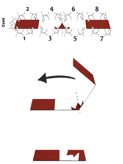 - Au commandement: « Préparez vous à plier », Les personnes 1 et 7, positionnées aux coins inférieurs du drapeau glissent leur main intérieure vers leur main extérieure et font un pas pour contourner le drapeau.