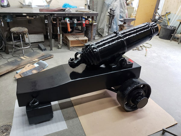 La caronade de 1805 du Musée naval de Québec en restauration. Ce canon est aujourd’hui exposé à l'entrée du Musée de façon permanente.