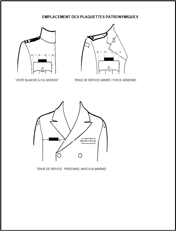 | 1. Plaquettes patronymiques | a. Vestes, tenue de service | 1) Portées comme il est illustré aux figures 3G2-1 et 3G2-2. Sur la veste bleu marine pour homme, la plaquette patronymique est centrée sur la couture de poitrine. Dans le cas du personnel féminin, la position verticale de la plaquette patronymique dépend de la stature de la personne et de la nécessité de ne pas cacher les insignes de commandement, de vol et de spécialiste. |