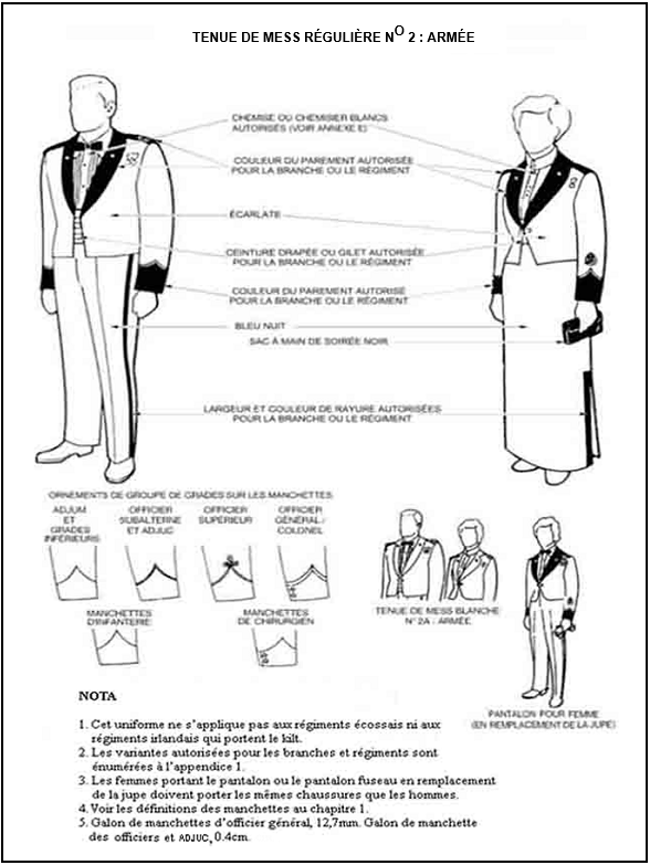 - Le présent appendice s’applique au personnel qui porte la tenue de service de l’Armée. L’annexe B ainsi que les figures 5B1-3 et 5B1-4 décrivent les tenues universelles de l’Armée no 2 (tenue de mess régulière) et no 2A (tenue de mess blanche). L’appendice fait mention des variantes autorisées des modèles universels. Les spécifications de confection détaillées peuvent être obtenues auprès du QGDN/DAPES et des conseillers de branche appropriés, par les voies d’approvisionnement habituelles.