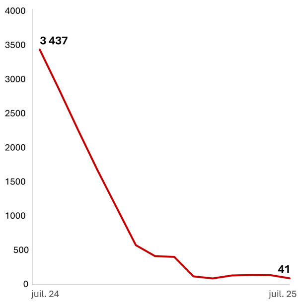 Les données révèlent une tendance claire et constante à la baisse des interceptions au fil de l'année. En juin 2024, le nombre d'interceptions atteint son point culminant, avec 3 437 personnes interceptées. Ce chiffre diminue régulièrement mois après mois, avec des baisses marquées à l'automne et en hiver. En juillet 2025, le nombre d'interceptions est tombé à 41 personnes.