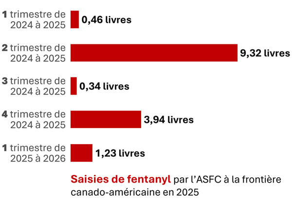 - En février et en mars 2025, l'ASFC a mené l'opération Blizzard, une opération d'envergure nationale visant à intercepter le fentanyl et d'autres drogues illicites dans des conteneurs postaux, de fret aérien et maritimes. Au total, l'ASFC a effectué plus de 2 600 saisies de substances illégales et de précurseurs présumés dans tout le pays, dont 3,8 livres de fentanyl et 131,7 livres d'autres substances telles que la méthamphétamine, la cocaïne et l'héroïne. 67,5 % de toutes les saisies effectuées concernaient des stupéfiants illégaux en provenance des États-Unis, tandis que 17,5 % concernaient des substances à destination des États-Unis