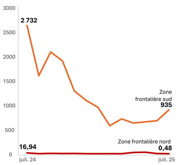 En revanche, les saisies de fentanyl à la frontière nord sont restées relativement faibles et stables tout au long de la période. Malgré quelques fluctuations mineures, la tendance générale est restée stable. En juillet 2025, la quantité saisie à la frontière nord était de 0,48 livre.
