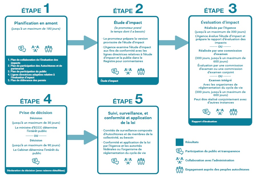 - Les dispositions législatives proposées suivent actuellement le processus parlementaire. La Chambre des communes a fini d’examiner le projet de loi C 69 et l’a renvoyé au Sénat, qui l’examinera à son tour. Si le projet de loi est adopté au Parlement, il pourrait recevoir la sanction royale en 2019 et entrer en vigueur au printemps 2019.